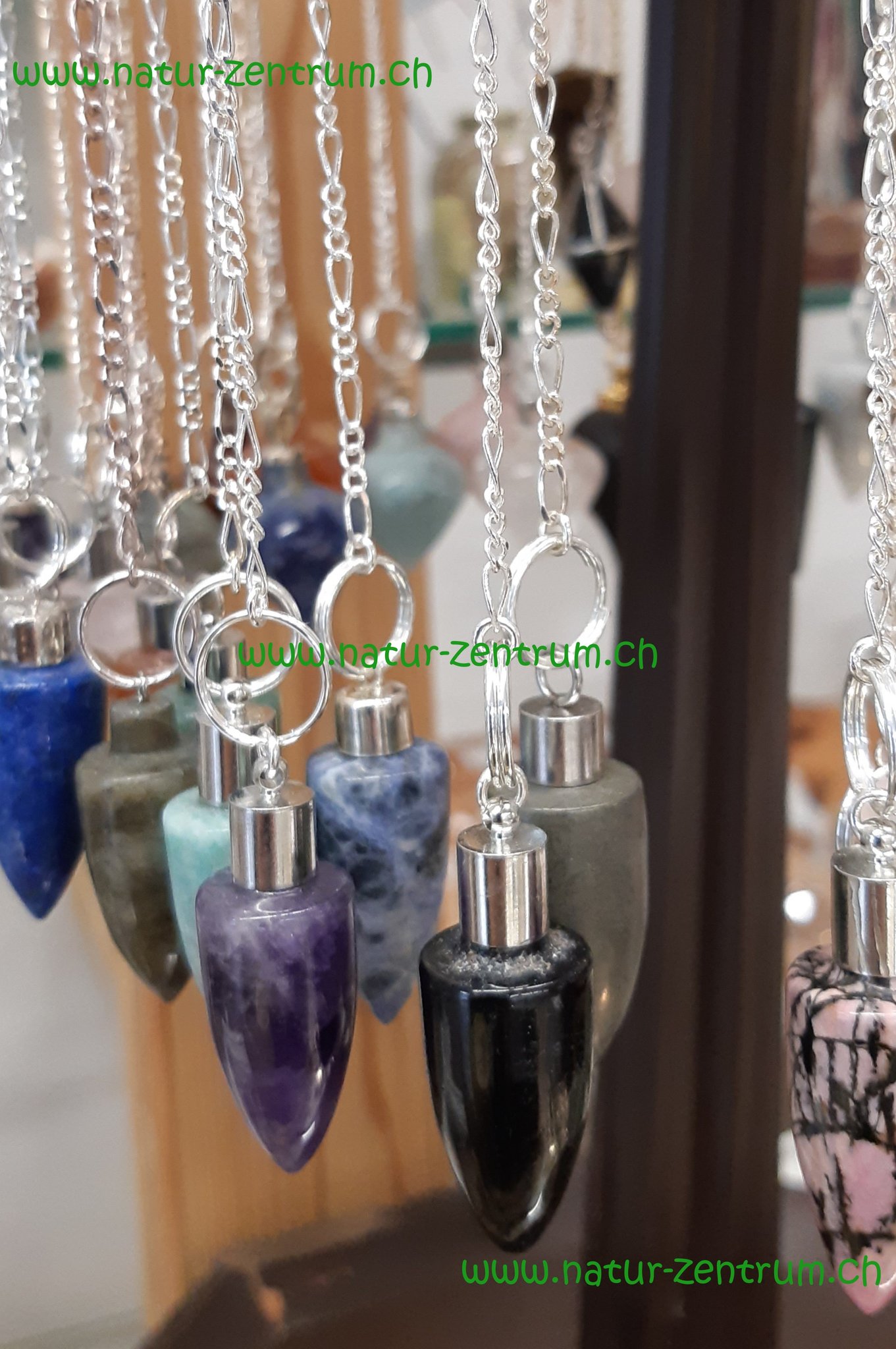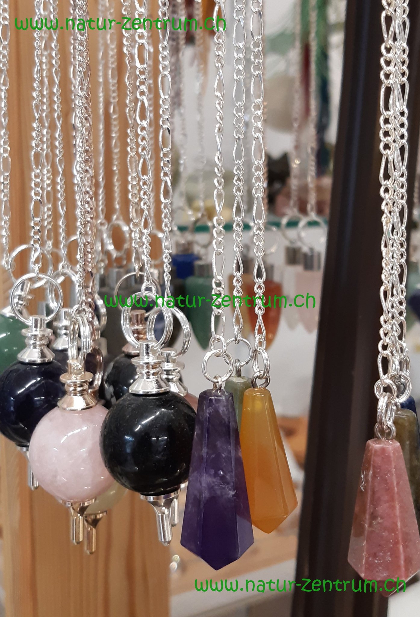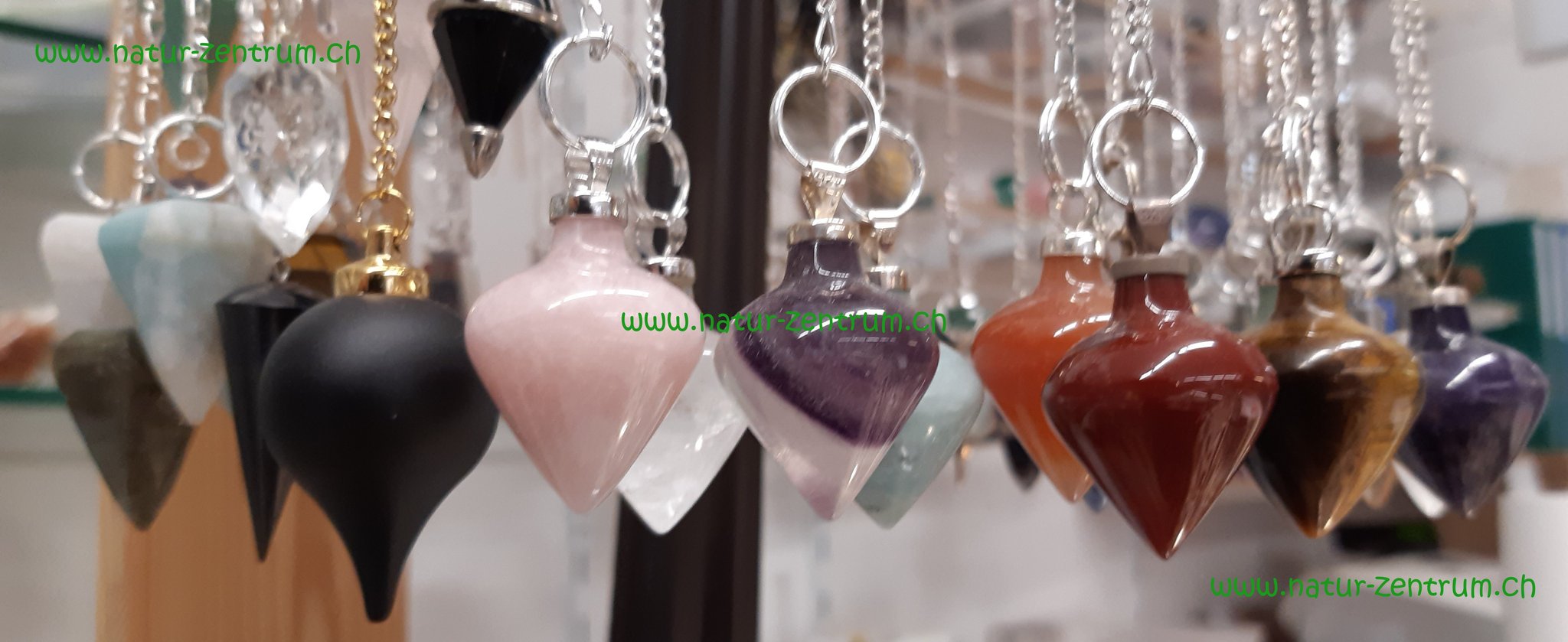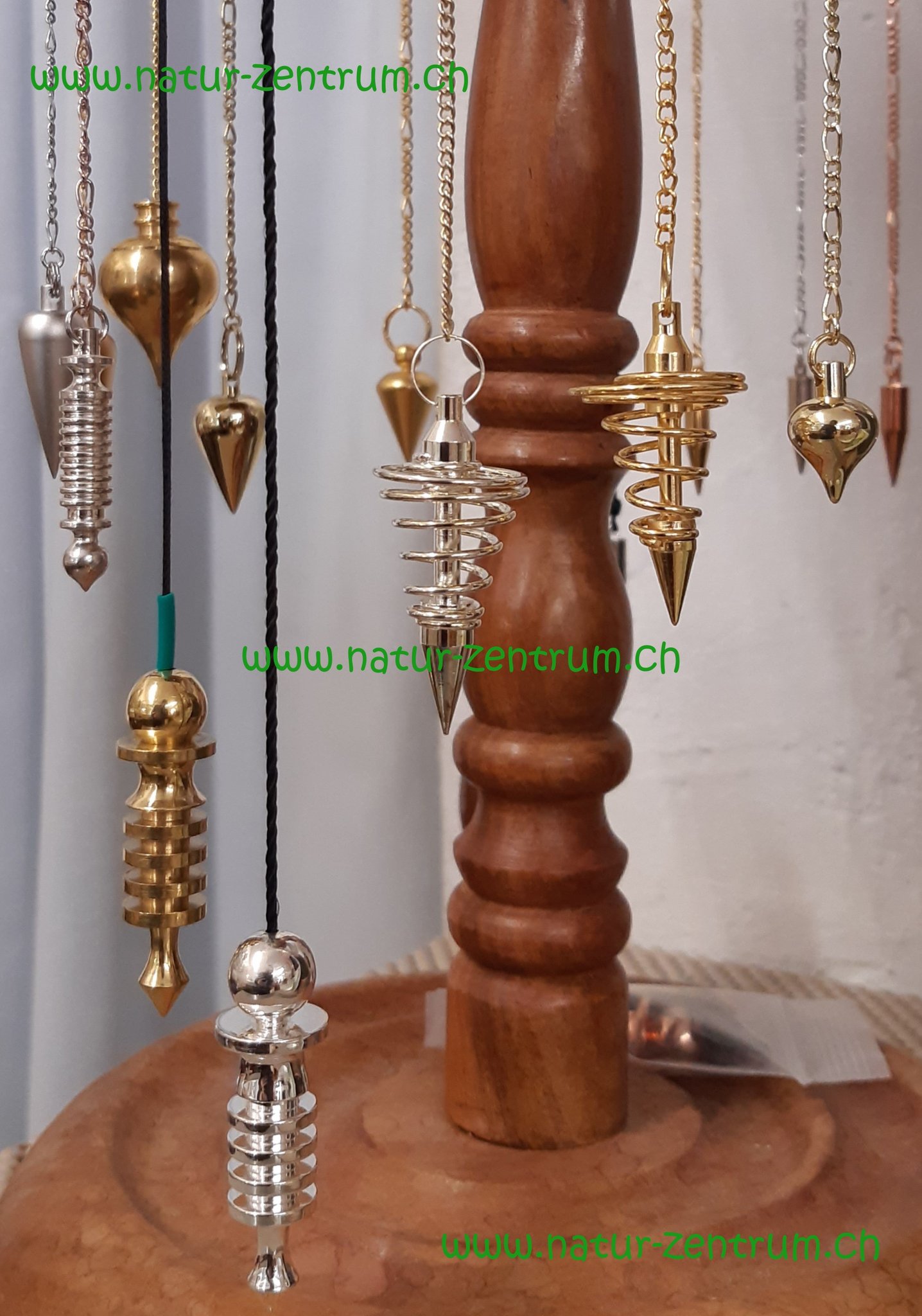 Pendel aus diversen Halbedelsteinen, Holz, Kupfer, Messing, Chrom in verschiedenen Formen und Grössen. Und natürlich darf hier auch der Tensor nicht fehlen.
